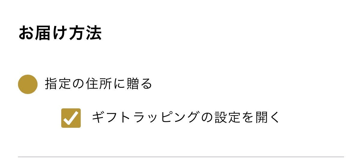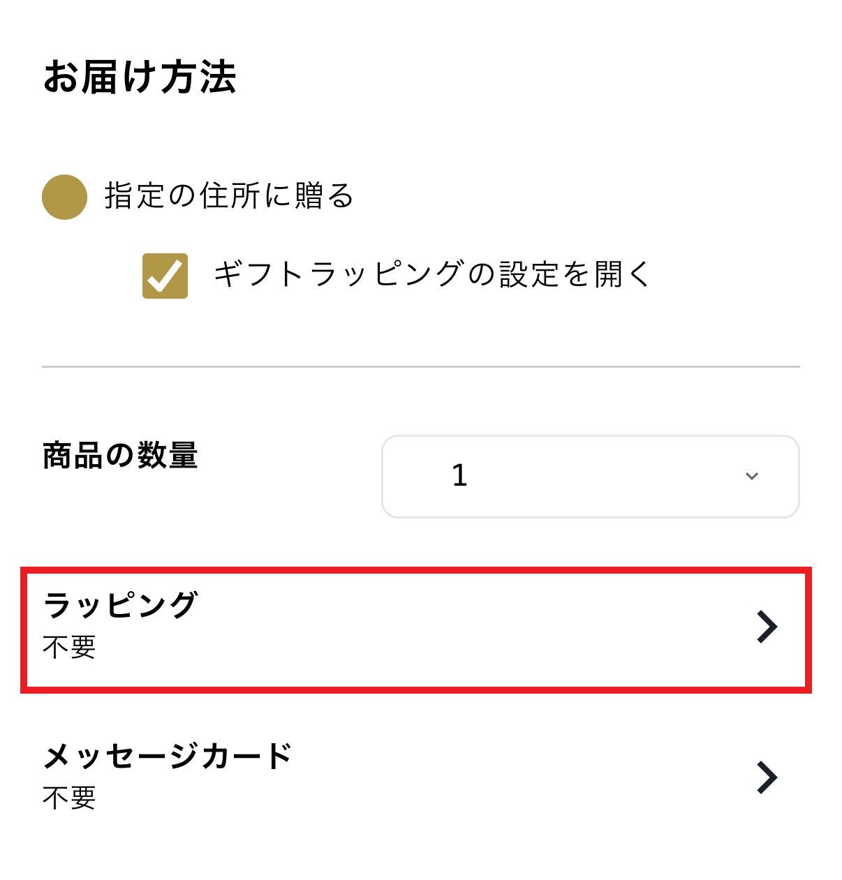 01.商品ページまたはカートページのお届け方法の項目から、「指定の住所に送る」→「ギフトラッピングの設定を開く」を選択する