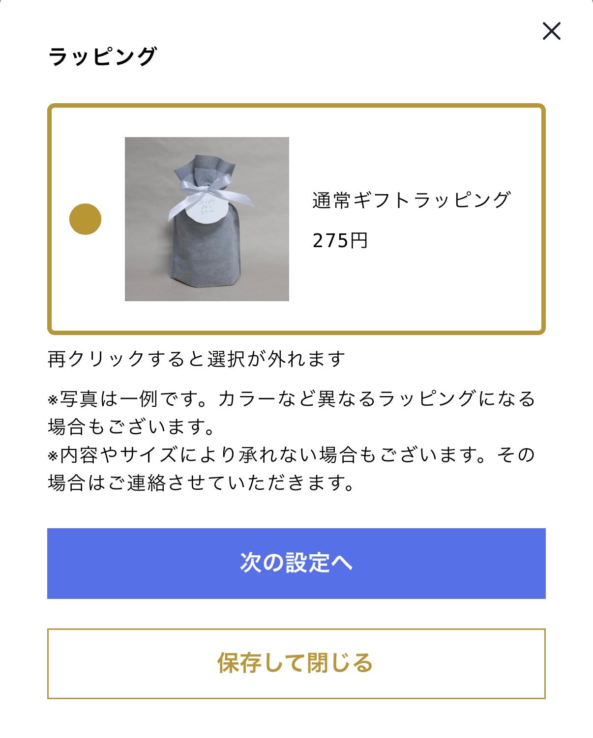 03.ラッピングを選択したら、「次の設定へ」のボタンをクリックし、メッセージカードの設定へ進む(メッセージカードが不要の場合は「保存して閉じる」を選択し、05へ)