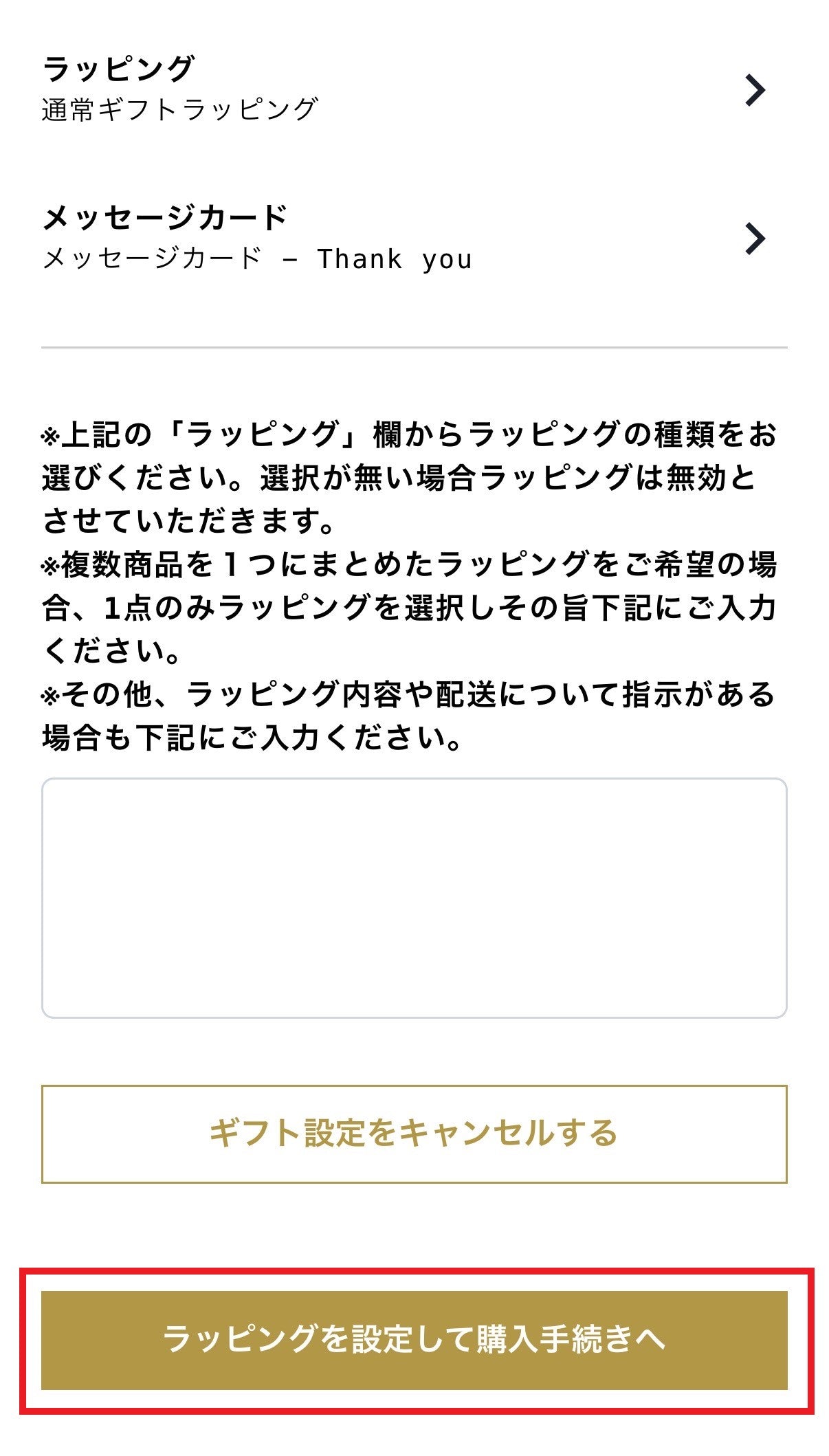 05.ラッピングとメッセージカードが正しく選択できている事を確認したら、「ラッピングを設定して購入手続きへ」または「購入手続きへ」のボタンをクリックし、購入手続きへ進む